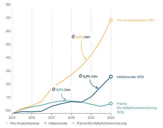 Betrachtet man die Preisentwicklung der Schadenkosten und die der Versicherungsbeiträge wird deutlich, dass die Beiträge der Kfz-Haftpflichtversicherung seit 2013 um knapp 7 Prozent im Durchschnitt gestiegen sind. Die Kosten für Pkw-Ersatzteile dagegen um rund 70% seit dem Jahr 2013.