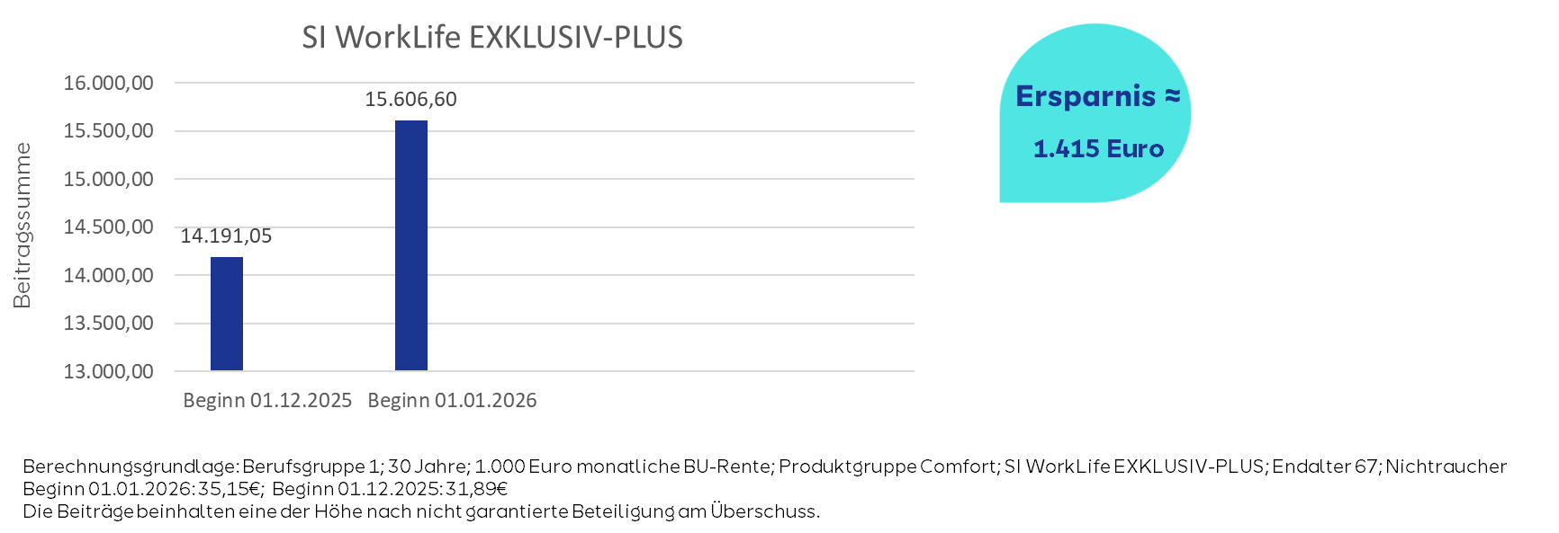 Auch wenn der Beitrag für den zusätzlichen Monat (oder die Monate bei einem Abschluss im Februar) entrichtet werden muss, ist der langfristige finanzielle Gewinn erheblich. Über die gesamte Vertragslaufzeit kann sich dieser Beitragsunterschied durch das niedrigere Eintrittsalter zu einer Ersparnis im vierstelligen Bereich summieren. Ein konkretes Beispiel für die Premium-Berufsunfähigkeitsversicherung SI WorkLife EXKLUSIV-PLUS verdeutlicht eindrucksvoll das Sparpotenzial.