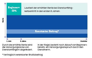 Der erhöhte Absicherungsbedarf von Beamten auf Widerruf und Beamten auf Probe in den ersten Jahren kann ab dem 01.01.2026 durch die Option Beginner+ in einem einzigen Vertrag gedeckt werden. Die Option hat die folgenden Merkmale: